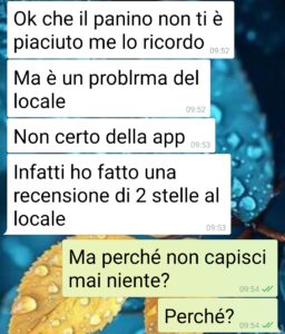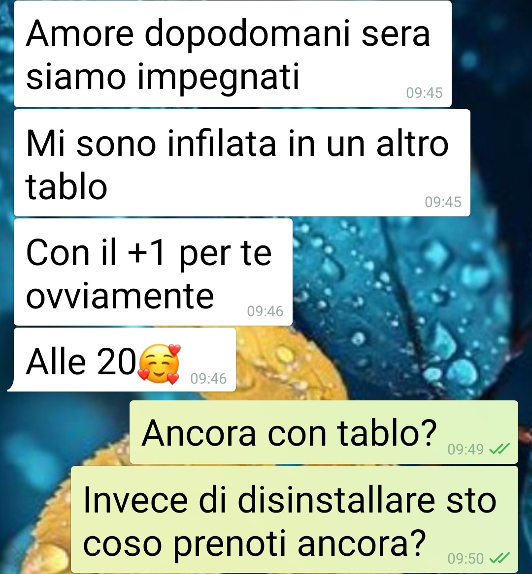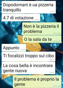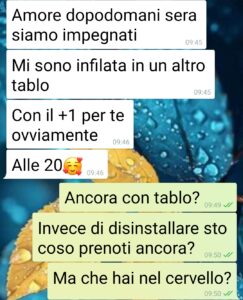 Ciao pagina di spunte blu, lettori e commentatori. Io sono Jacopo e porto alla vostra attenzione questi screen che derivano da una chat con la mia fidanzata, Sara. Da qualche settimana è venuta a conoscenza di questa app, Tablo, per “incontrare gente nuova con tavoli conviviali in qualche locale”. Io ne avevo sentito parlare ma onestamente non mi attirava per nulla. Lei però ha voluto provare e mi ha trascinato in 3 serate in 2 settimane. Questa chat, con relative opposte opinioni, nasce ieri quando mi comunica che ha già pronta un’altra “Tablata”. Eh no basta! Ma come fa a non rendersi conto di quello che succede a queste serate? Io le trovo di uno squallore… Qualcuno vuole negare che sono speed dating mascherati, senza fretta? E quello che mi fa girare gli ammennicoli e non sapere se Sara lo fa apposta e ci sguazza o se davvero pensa di trovare nuovi amici”