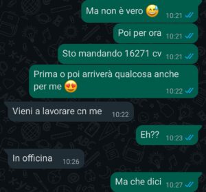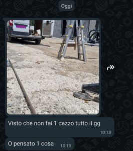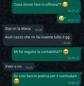 Da quando mi sono laureata sto cercando lavoro, perché voglio andarmene, ma non è facile lo ammetto, e ho diversi momenti di sconforto. Poi lui mi ha scritto proponendomi di andare a lavorare nella sua officina e ci ho sperato. Mi sono detta: “magari vuole davvero darmi una mano, magari mi fa fare qualcosa di utile, così metto un piede nel mondo del lavoro e faccio pratica”. Ero persino entusiasta. Ma quello che mi sono trovata davanti non era affatto quello che immaginavo. Il tono, le parole, l’atteggiamento… Quello che per lui è un’“occasione” per me era solo una presa in giro, e quello che per me era un aiuto, per lui si è trasformato nell’ennesima occasione per sminuirmi, offendermi e farmi sentire un peso.