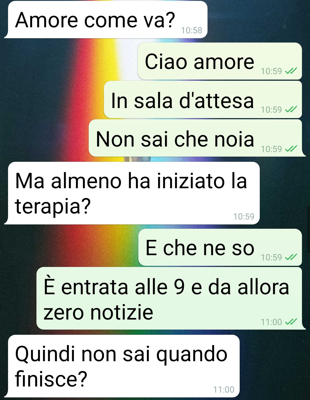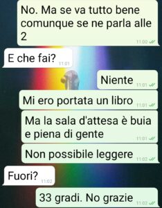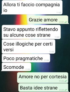 “Il mio fidanzato si fissa su delle fesserie della vita e mi ammorba con discorsi interminabili senza valore. L’ha sempre avuta questa caratteristica, vede qualcosa, gli viene una illuminazione, e comincia a filosofeggiare, si crea trattati e protocolli e poi mi tocca subire tutti questi sproloqui. Stavolta è stato via chat e quindi posso rendervi partecipi di questa mania. Ho accompagnato mia madre in ospedale per una terapia e lui con la scusa di farmi compagnia mentre aspetto mi ha intortato con questa cosa. Stavolta se l’è presa con il cibo da supermercato e come è tagliato. Tra il caldo e le ore di attesa è un po’ di preoccupazione era già cotta di mio e sono stata meno paziente del solito. Ma è davvero pesante! Ma vi pare normale? E ne ha una al giorno! Sicuro che tornerà alla carica per gli incarti dei biscotti. Buona lettura, e se avrò tempo e voglia vi manderò qualche perla del passato, come il taglio dei finocchi, il travaso delle piante o l’accappatoio a consistenza differenziata…”