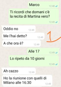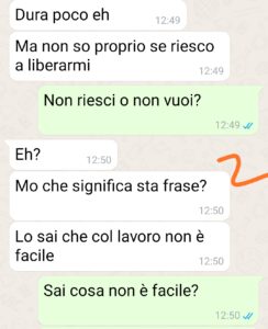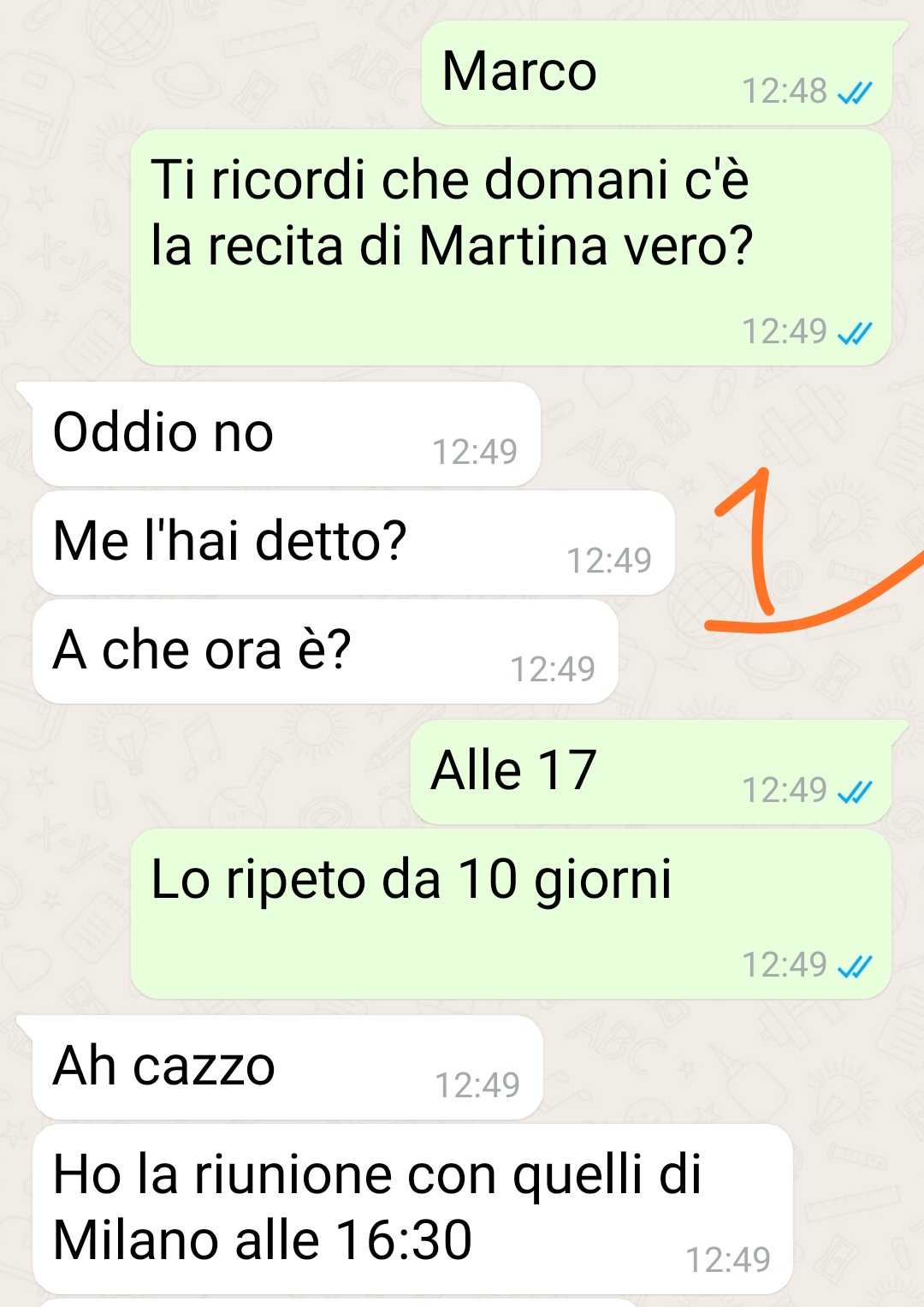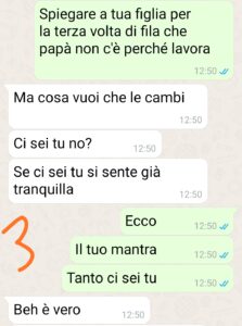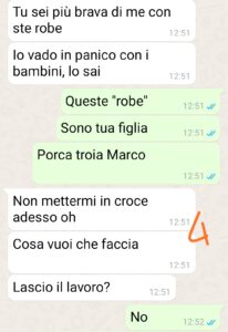 “C’è una frase che mi rimbomba in testa da anni: “Ma dai, ci sei tu per queste cose”. Ho due figli, una casa da gestire e un lavoro vero. E ho anche un ex compagno, il padre dei miei figli, che da quando non stiamo più insieme sembra convinto che la genitorialità funzioni a turni… i miei. Per ogni problema, necessità o imprevisto, la risposta è sempre la stessa: “Tanto ci sei tu”. Ho provato a farlo ragionare. L’ho scritto con calma, poi con rabbia, poi con ironia. Ma lui ha sempre una scusa. Questa è la chat. La realtà di tante madri. E forse anche di troppi padri.”