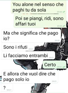 Ciao amici di spunte blu. Ho per voi questa chat che ho avuto con Katia. Siamo fidanzati da 4 anni e da 2 abbiamo iniziato a convivere. Entrambi abbiamo una appartamento tutto nostro, anche perché vivevamo già da soli (e ci mancherebbe, a quasi 40 anni…). Comunque mi sono trasferito io da lei, nella casa che le ha lasciato la nonna, che lei da me non è voluta venire. Preferiva rimanere con le sue comodità… Ok nessun problema. E in effetti sono 2 anni che conviviamo senza problemi. È stata la scelta giusta, siamo uniti e innamorati direi. Ma adesso è arrivata la tassa sui rifiuti, e lei pensa che dovremmo dividere questa spesa, come facciamo con le bollette. Mi sono rifiutato categoricamente. Ci è rimasta male e non si spiega il perché. Ma c’è un perché, e dovrebbe pure saperlo bene. Ma forse è meglio fare la finta tonta. Io adesso mi godo il momento. E aspetto…”