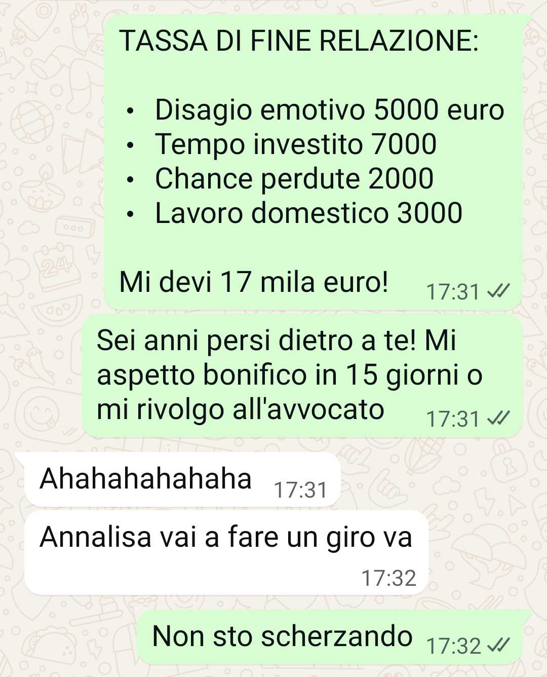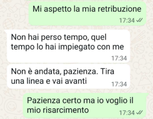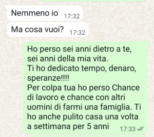 Voglio un risarcimento per il disagio emotivo che mi ha causato, per le occasioni sentimentali e lavorative che ho perso con lui, per il mio lavoro a casa sua di pulizia settimanale, per i soldi che ho speso per lui. Non chiedo molto. 17.000 euro sono pochi.