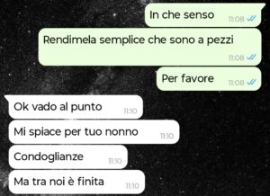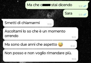 Vi allego la conversazione perché ancora faccio fatica a crederci io stesso. Ma come si fa? Ma che persona è quella che fa una cosa del genere? Ma soprattutto: come ci si rialza da una batosta del genere?”