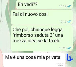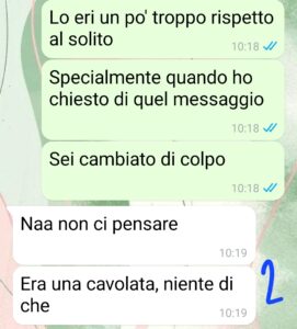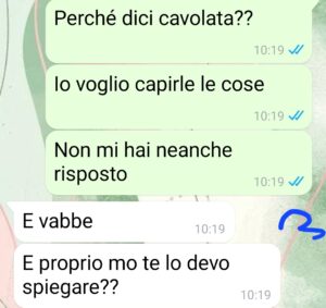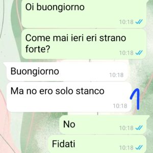 Poi mentre parlavamo gli è arrivata una notifica e Io l’ho letta al volo perché era lì, davanti, e lui… ha cambiato faccia. Proprio irrigidito, come se avessi visto qualcosa che non dovevo. E quando gli ho chiesto “cos’è?”, anche se un minimo si capiva, lui è diventato acido in mezzo secondo. Guardate che ho scoperto, sono ancora shockata”