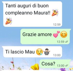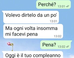 Proprio oggi che faccio il compleanno il mio ragazzo mi lascia però. Mi lascia per messaggio e non mi risponde alle chiamate per avere spiegazioni. Il motivo? Lo lascio scoprire a voi in chat ;(”