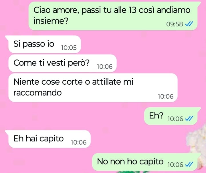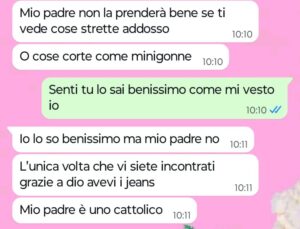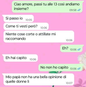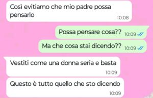 “Ciao Spunte Blu, vi scrivo perché sono estremamente irritata e mi sento super offesa dal mio ragazzo. Oggi io e lui dovevamo andare a pranzo da suo padre e scrivo dovevamo in quanto alla fine io mi sono rifiutata di andarci, perché se è vero che sono accondiscendente e comprensiva con tutti, è anche vero però che non sono fessa e non ci tengo ad essere calpestata così dalle persone. Stamattina ho scritto al mio ragazzo per chiedergli appunto se sarebbe passato lui da me alle 13 per andare insieme da suo padre, lui mi risponde di sì ma poi inizia anche a farmi il terzo grado su una cosa che io trovo veramente ridicola e superficiale. Lui dice che lo fa per il padre, per non farlo restare male e per far sì che lui non si faccia subito una cattiva opinione di me. Vi rendete conto a che livello siamo? Dice che se mi presento a pranzo dal padre come vorrei presentarmi, allora poi lui dovrà sorbirsi lunghe prediche dal papà rispetto alla ragazza terribile e poco seria con cui si è messo. Quindi io sarei una ragazza terribile e poco seria se mi presento a suo padre come sono solita fare con tutti. Insomma, per il mio ragazzo non posso essere me stessa davanti a suo padre altrimenti rischio di passare per una brutta persona. Siamo arrivati al paradosso veramente.”