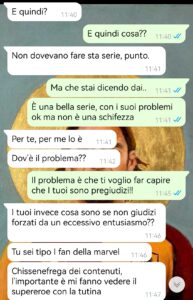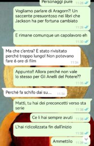 Con il mio amico Mattia parliamo spesso di serie Tv e abbiamo lo stesso gusto per il fantasy ad esempio. Conosciamo a memoria la trilogia di Jackson e i libri di Tolkien. Sulla serie Tv ci siamo divisi: io l’ho apprezzata, lui invece l’ha odiata.
