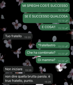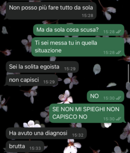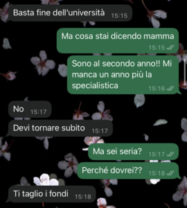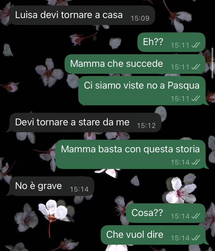 È un po’ pressante, ma non la giudico. Anche lei vive una situazione difficile. Comunque, sono sotto shock perché l’altro giorno mi ha scritto dicendomi una cosa assurda, è successa una cosa e secondo lei io dovrei tornare subito a casa.