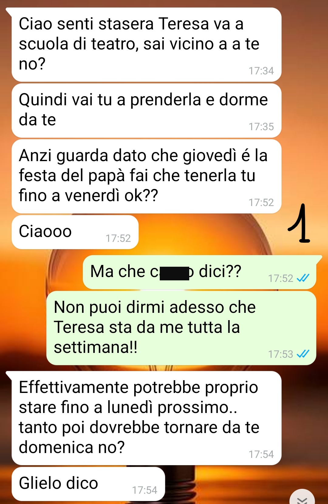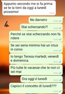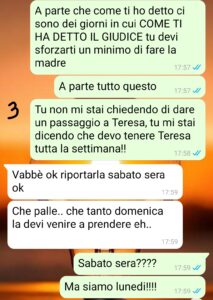 Comunque dopo avvocati, litigi furibondi e sentenze in tribunale la situazione pare finalmente normalizzata se non che, a volte, la mia ex si fa ancora uscite assurde come oggi, quando di punto in bianco.. beh leggete..”