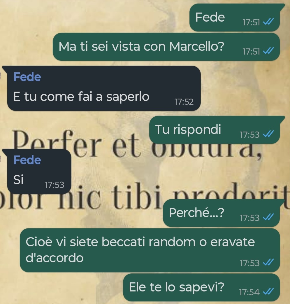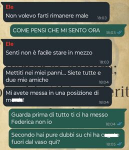 Ciliegina sulla torta? Ho scoperto che una di loro, Federica, non aveva tagliato i ponti col mio ex, come di solito succede quando una tua amica si molla. E non è tutto, perché quando sei un’infame fai le cose fino in fondo. Tra le due non so chi sia peggio, davvero.
