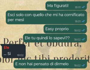 Marcello, il ragazzo con cui stavo da quasi un anno, ha passato gli ultimi mesi a riempirmi di corna, cosa che ho scoperto proprio di recente. Le mie amiche, che davanti mi sorridevano, hanno iniziato a coinvolgermi sempre meno perché per un motivo o per l’altro non potevo più uscire con loro come prima.