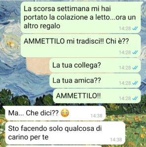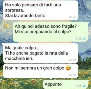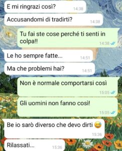 “Ho cominciato a insospettirmi con tutti i bei regali che stava facendo. Cioè, ma quale uomo si appunta quello che vuoi e te lo fa trovare senza pressioni? Senza dovergli ripetere mille volte che ti piace quella collana o quella borsa? E in più mi dava soldi se mi servivano… Anche senza chiedere. Robe da matti.