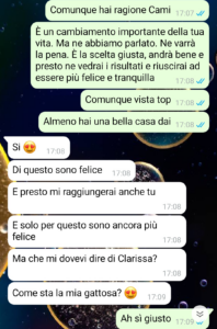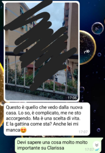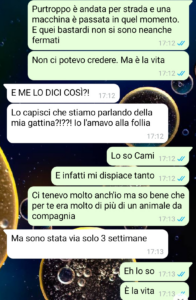 La mia fidanzata Camilla, circa un mese fa, si è trasferita a Roma. Noi non siamo gente di città quindi è stato un cambiamento grande, fatto per lavoro ma anche e soprattutto per inseguire i suoi sogni nell’unica città in Italia che, in questo momento, potrebbe aiutarla a realizzarli. Io sono pronto ad una relazione a distanza, non è un problema. Ma, ovviamente, un cambiamento così grande scuote un po’ gli equilibri, e bisogna capire come comportarsi. Ci si allontana dalla famiglia, ci si allontana dagli affetti, e ci si allontana anche dagli animali domestici. Camilla aveva una gatta qui, e non è stato facile per lei allontanarsi da essa. E quando ci siamo sentiti, l’altro giorno, ho dovuto darla una notizia davvero importante sulla gatta.”