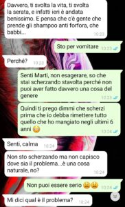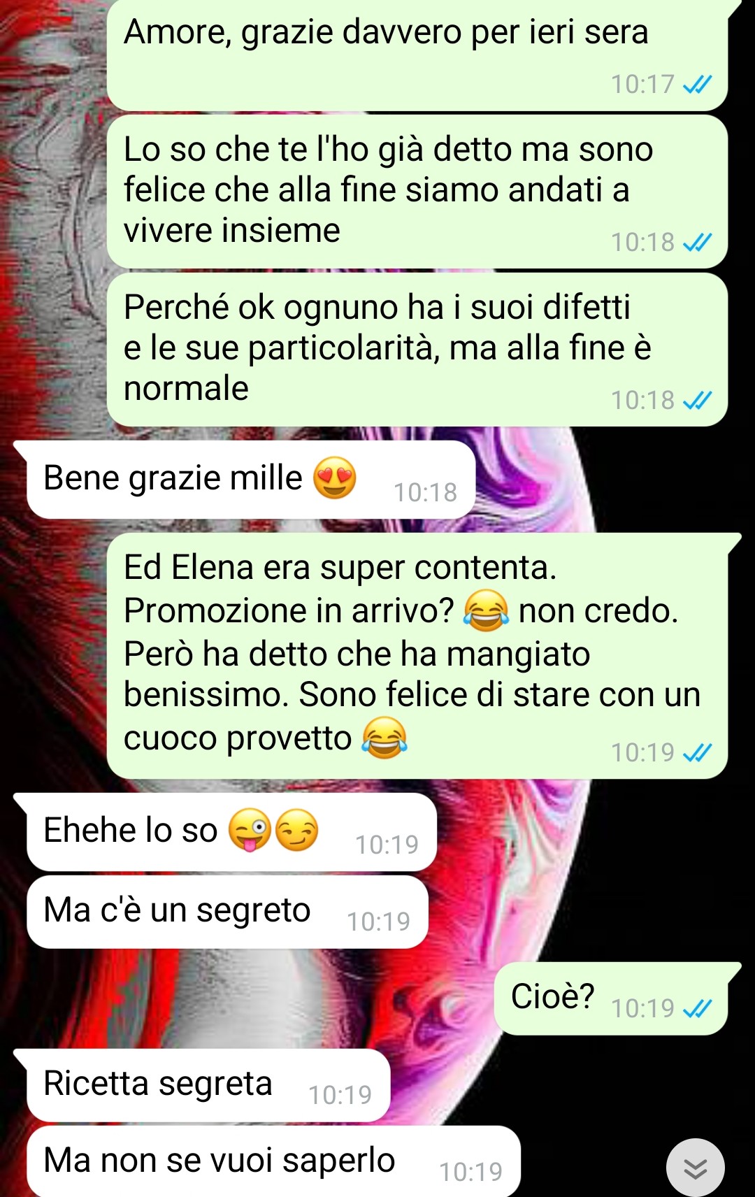 “Alla fine, dopo averci pensato lungamente, ho deciso di perdonare Martino (più che perdonarlo di accettare lui e le sue stranezze del caso) per il bene della coppia. Erano mesi che sognavamo questa convivenza e per quanto quello che avevo scoperto su questo suo modo di fare fosse strano e difficile da accettare, alla fine era una peculiarità sua, intima, che non avrebbe intaccato più di tanto la coppia. Quindi abbiamo parlato, ne abbiamo discusso, lui mi ha detto che rispettandomi non l’avrebbe mai più fatto e io ho deciso di credergli. Alla fine abbiamo affittato la casa e le prime due settimane sono andate benissimo, tanto che ero davvero felice della scelta che avevo preso, nonostante tutto. Poi il dramma. Non curante dei rischi, ho deciso di invitare a cena Elena, il mio capo con cui sono comunque molto in confidenza, e avrebbe cucinato Martino, che è un ottimo cuoco e molto spesso (purtroppo, pensando a cosa è successo dopo) cucina per me. In realtà la cena è andata bene e tutto è piaciuto a tutti. Il problema, e al solo pensiero sto male, è nato con la tragica scoperta che ho fatto il giorno dopo.”