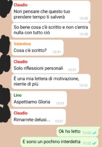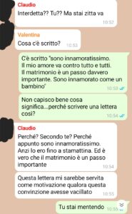 “Come detto, nel giro di pochi minuti la mia vita era cambiata ed era appesa ad un filo. Un attimo prima stavo per sposarmi e ora tutti, purtroppo, erano convinti che avessi tradito il mio futuro marito (tra l’altro accusata di averlo fatto con nostri amici, cosa che mai neanche mi sognerei) e tutto stava per saltare. Come detto a loro lo ribadisco anche qui. Io non ho mai tradito Claudio. Non l’avrei mai fatto, non fa parte di me. Avevo provato, in ogni modo, a giustificarmi, ma non era servito. Purtroppo quando salta fuori un test di gravidanza, anche il più fedele degli amici tentenna, quando invece sarebbe sufficiente fidarsi di chi si dovrebbe amare. In ogni caso, avevo appena trovato quella lettera scritta da Claudio, forse non la prova definitiva del fatto che avessi ragione, ma grazie a quella mi si è accesa una scintilla e piano piano i pezzi del puzzle sono andati al loro posto. Sono ancora sconvolta, ma chi non lo sarebbe al mio posto? Vi dico solo che sono stati alcuni tra i peggiori attimi mai vissuti in vita mia, soprattutto quando ho scoperto la verità.”
