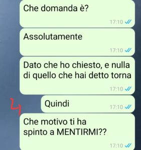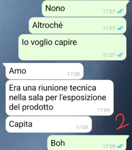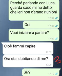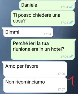 Così indago perchè di base mi sembrava tutto troppo strano così all’improvviso e parlo con un suo collega che, senza nemmeno pensarci, mi dice: “Riunione? Ale, ieri Daniele non era con noi… pensavo fosse con te.”