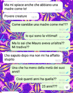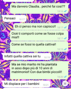 Alcune settimane fa ho finalmente capito cosa stava succedendo: lui aveva un’altra!!.. Ora lui mi ha lasciato e il mio mondo è crollato.. inoltre la sua famiglia mi odia e sta dalla sua parte..”