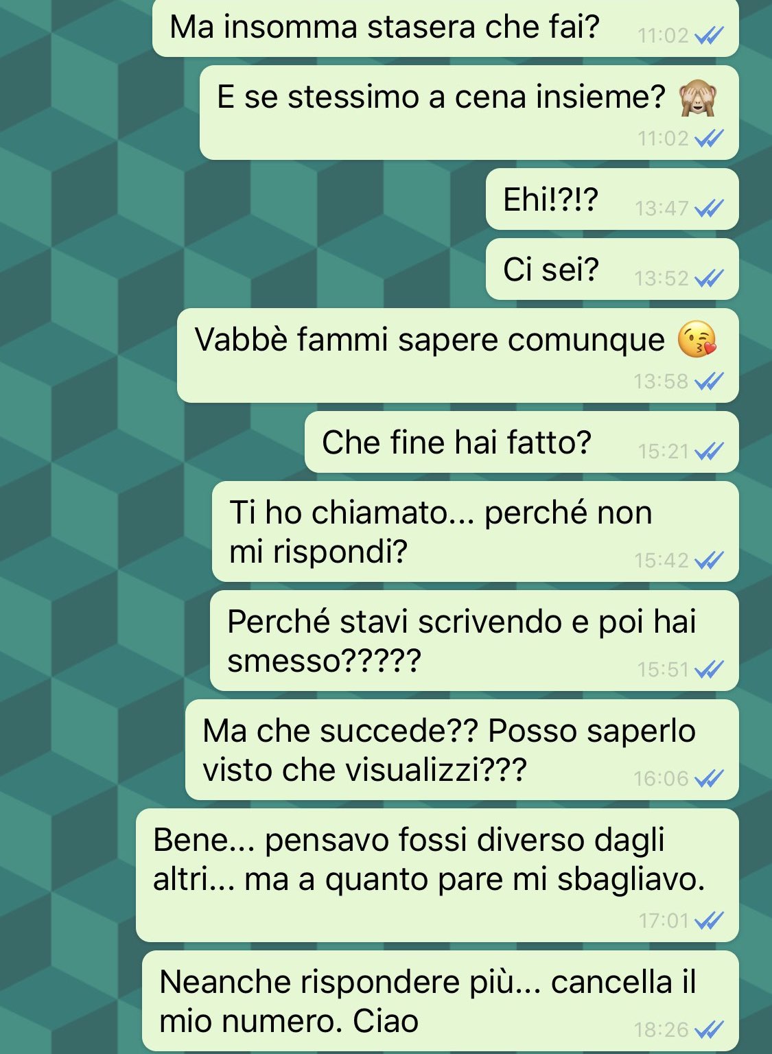Avete presente quando dobbiamo andare al primo appuntamento con una persona e siamo più in ansia di nostra nonna quando deve preparare il pranzo di Natale? E’ il caso di questa ragazza, che ci invia i suoi screen per raccontarci tutto quello che è successo con il tizio che aveva conosciuto su Tinder.