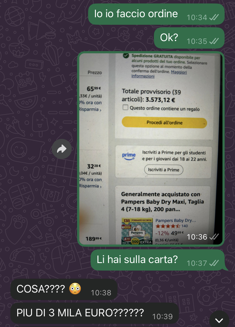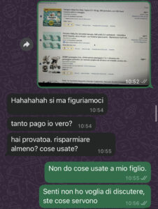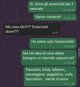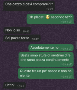 E niente, vi lascio qui sotto uno spaccato delle nostre chat, così magari capite meglio di cosa parlo… perché l’altro giorno abbiamo avuto una furiosa discussione. Ma io cosa dovrei fare? Ps. Io non lavoro.