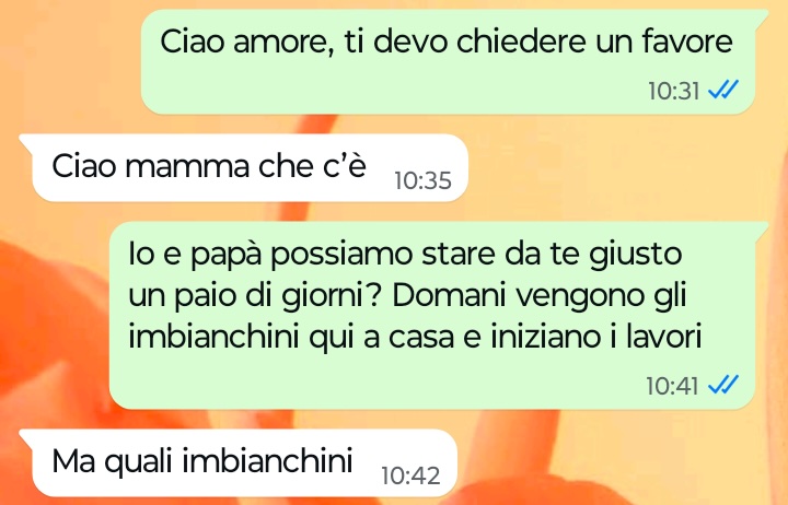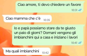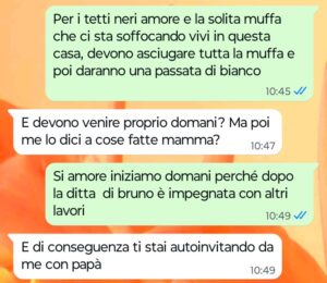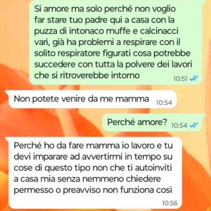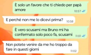 “Salve Spunte Blu, il mio nome è Annalisa. Vi seguo spesso perché la vostra pagina mi rilassa e mi diverte ma oggi ho deciso di inviare anche io una mia chat in quanto molto delusa e amareggiata da mio figlio. Mio figlio vive ormai da solo e ha la sua indipendenza di giovane adulto. Poco tempo fa mio marito si è ammalato ai polmoni e ora purtroppo è costretto a stare attaccato ad un respiratore;. stamattina ho scritto a mio figlio per chiedergli un favore anche e sopratutto in merito alla condizione di suo padre malato e leggete come mi ha risposto lui. Sono amareggiata perché sto parlando di mio figlio, la persona che io e mio marito abbiamo nutrito e cresciuto con un bene immenso e ora questo è il risultato che riceviamo come genitori.”