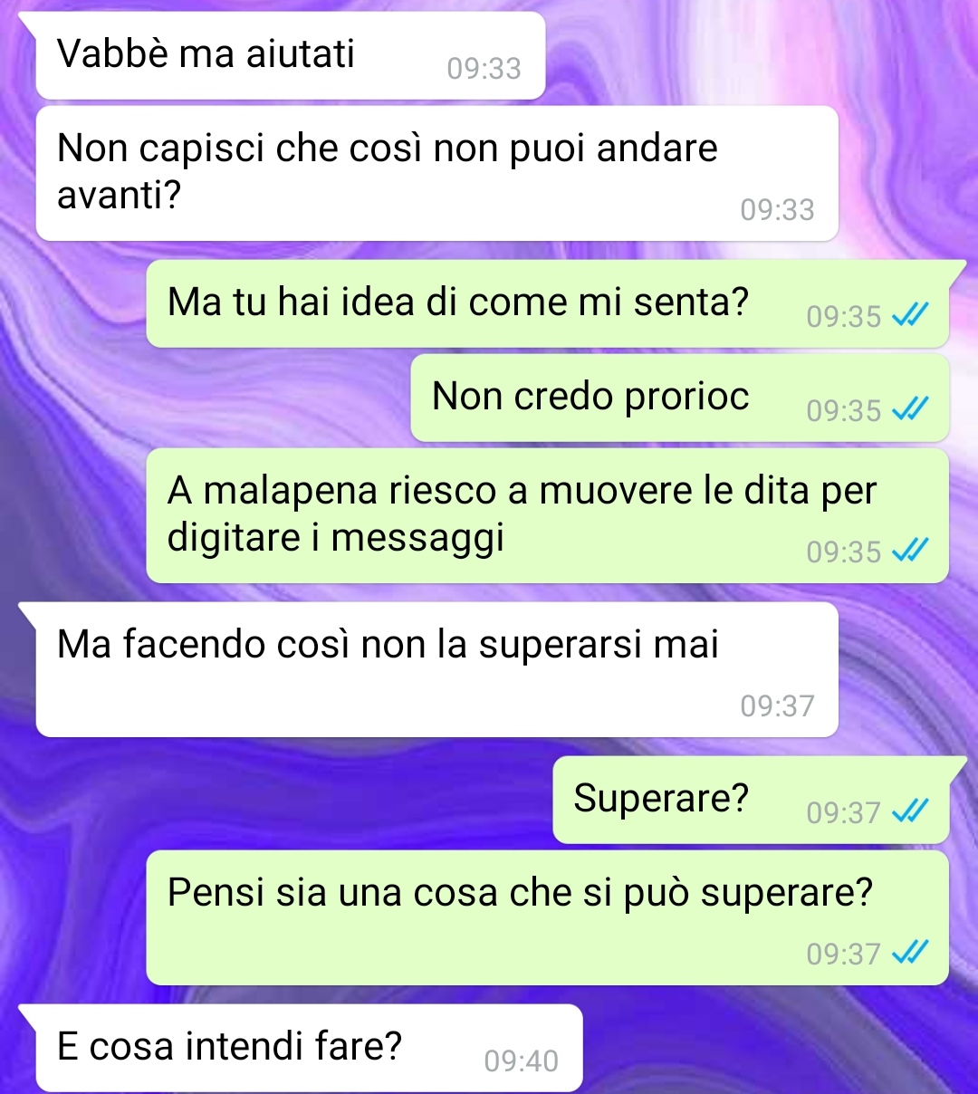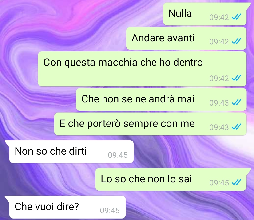 La mia storia, come avete potuto intuire, è una storia triste, subire quello che ho subito io non lo auguro nemmeno al mio peggior nemico, ma come dico al mio ormai ex ragazzo, la cosa che mi ha fatto ancora più male e stato il suo comportamento. Io mi sono aperta e confessata con lui ancora prima che con chiunque, ancora prima di farlo con i miei genitori, e lui mi ha ricompensato con questo, con diffidenza, dubbio, distanza e freddezza.”.