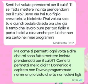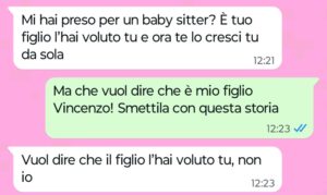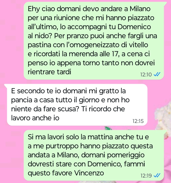 “Ciao Spunte Blu mi chiamo Lucrezia e sono una mamma lavoratrice anche se per fortuna, salvo rari casi, il mio lavoro di ufficio lo gestisco sempre e solo la mattina in modo tale da dedicare l’intero pomeriggio al mio piccolo Domenico. Il problema nella nostra famiglia però è rappresentato da mio marito e aspettate di leggere la conversazione che ho avuto oggi con lui per scoprire il perché. Ditemi voi come devo fare a gestire una situazione così incredibile e paradossale in casa perché io non ne posso proprio più e non so nemmeno a chi rivolgermi adesso, ve lo giuro…”