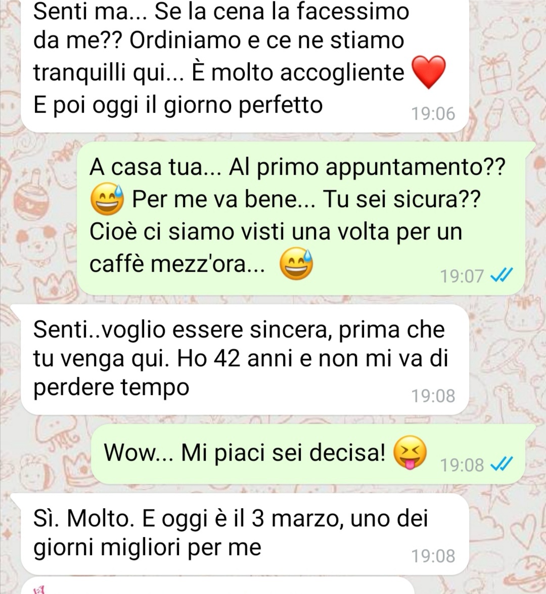 Quella sera mentre ci stiamo scrivendo per definire i dettagli, poco prima di vederci, lei se ne viene fuori con una proposta che mi spiazza: lasciar perdere il ristorante e andare da lei.