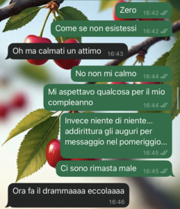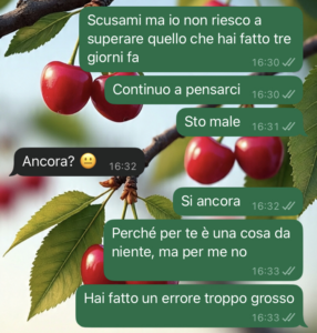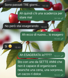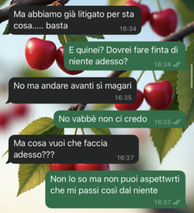 Non riesco a pensare ad altro da giorni, quindi anche se era a lavoro gli ho scritto e la sua risposta mi ha spiazziata. Da lì è partito il litigio….