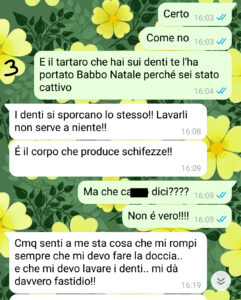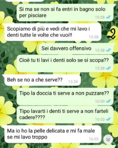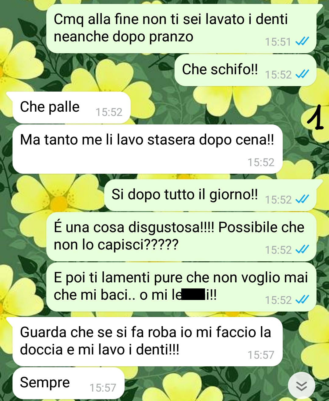 “Mi chiamo Laura e sto da poco con Simone, abbiamo io 24 anni e lui 28.. lui è davvero un bel ragazzo, il più bello con cui sia mai stata! Davvero, non esagero: è alto, biondo con gli occhi azzurri e ha un fisico da capogiro!! Tutte le mie amiche mi ritengono una donna fortunata! Che posso dire.. lui è davvero bellissimo, non si può negare, ma ha un difetto che io non riesco proprio ad accettare: è sporco! Simone si lava solo se ha un ottimo motivo per farlo: ad esempio se deve andare a lavoro, se va a una festa o se sa che passiamo la notte insieme.. se invece non è, diciamo, costretto, se ad esempio dobbiamo solo vederci per guardare la tv insieme a casa, allora non si sforza, anzi! Devo dire che la cosa mi fa imbestialire non poco!! Trovo davvero offensivo che lui pensi di fare la doccia o di lavarsi i denti solo se c’è possibilità di fare qualcosa, mentre se sa già che non si fa allora, che tanto torno a dormire a casa mia, io me lo devo avere a fianco che puzza.. e magari mentre si mangia cena!! L’altro giorno per l’ennesima volta non si è lavato i denti..”