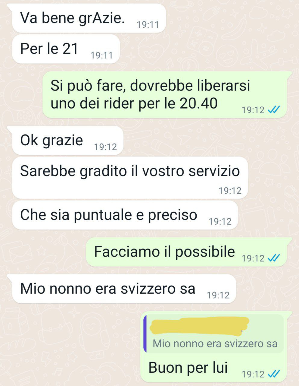 Sul whatsapp business della nostra pizzeria infatti ho ricevuto un ordine da parte di un soggetto veramente strano. A parte l’arroganza , ma non ho ancora capito se effettivamente mi stessero prendendo in giro o meno, beh c’è da dire che comunque ci ho pensato io a soddisfare le sue particolari richieste, indipendentemente che fosse uno scherzo o meno! Leggete tutto e fatevi un paio di risate!!”