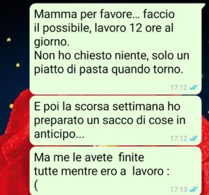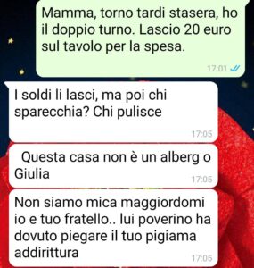 E poi c’è Marco, mio fratello, due anni più giovane. Vive ancora qui, non paga niente, non fa niente. Ma a lui nessuno dice mai nulla. Quando rientra tardi, va bene. Se lascia i piatti nel lavandino, va bene. Se dorme fino a mezzogiorno, “è stanco poverino”.