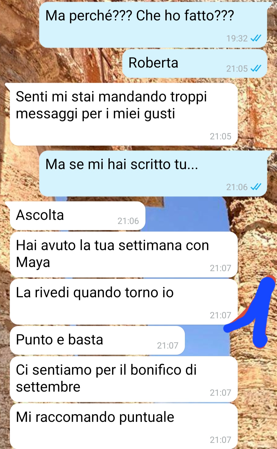 “Maya ha solo otto anni e mi pento ogni giorno di aver tradito Roberta perché so che tutto questo ha fatto male a entrambe e non voglio che la bambina cresca vedendomi come un mostro. Ho fatto una cosa che non avevo mai fatto in vita mia, di cui io stesso mi sono schifato, perché tradire non è mai stata un’opzione per me. Sono stato ingenuo ma so che ho tante colpe. Quello che sto cercando di fare adesso è esserci in ogni modo per Maya e darle tutto quello che posso per farla stare bene, ma Roberta mi sta mettendo i bastoni tra le ruote. E sta facendo un danno a nostra figlia. Ripeto so che è tanto colpa mia ma ora a cosa serve comportarsi in questo modo? togliere soldi a una bambina per farsi le vacanze? Io non so davvero come lei non capisca questo discorso. Roberta continua a non lavorare e vive con i miei soldi e quelli dei suoi genitori.  Vi sembra normale? Non so davvero come recuperare almeno un rapporto civile con lei…”