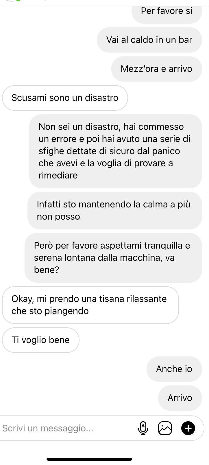 “Niente, alla fine verso le 20:30 sono arrivata nel fatidico posto dove è successo il tutto. Alla fine mi ha rotto il fanale posteriore sinistro e mi ha un po’ ammaccato la carrozzeria… Siamo riusciti a far partire l’auto con i cavi e in realtà la strada non era così ridotta male, a parte alcuni tratti, e sono riuscita a tornare in città con facilità, senza mettere le catene e nonostante le gomme estive, ma io sono abituata a guidare su quelle strade. Infatti non ero neanche troppo arrabbiata per l’auto ma ero davvero incazzata per come fosse stata incosciente e irresponsabile a percorrere quella strada con le sue scarse capacità automobilistiche, gomme non adatte e manto stradale difficile. Non avete idea di come sia andata giù dritta in quel tornante. Non oso immaginare se fosse successo in una curva verso l’altro lato, con il vuoto oltre il guardrail. Per fortuna è andato tutto bene! Ragazzi, ho deciso di mandarvi questi screen per ricordarvi di fare attenzione e di essere sempre responsabili, mi raccomando. Un bacio!”
