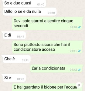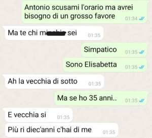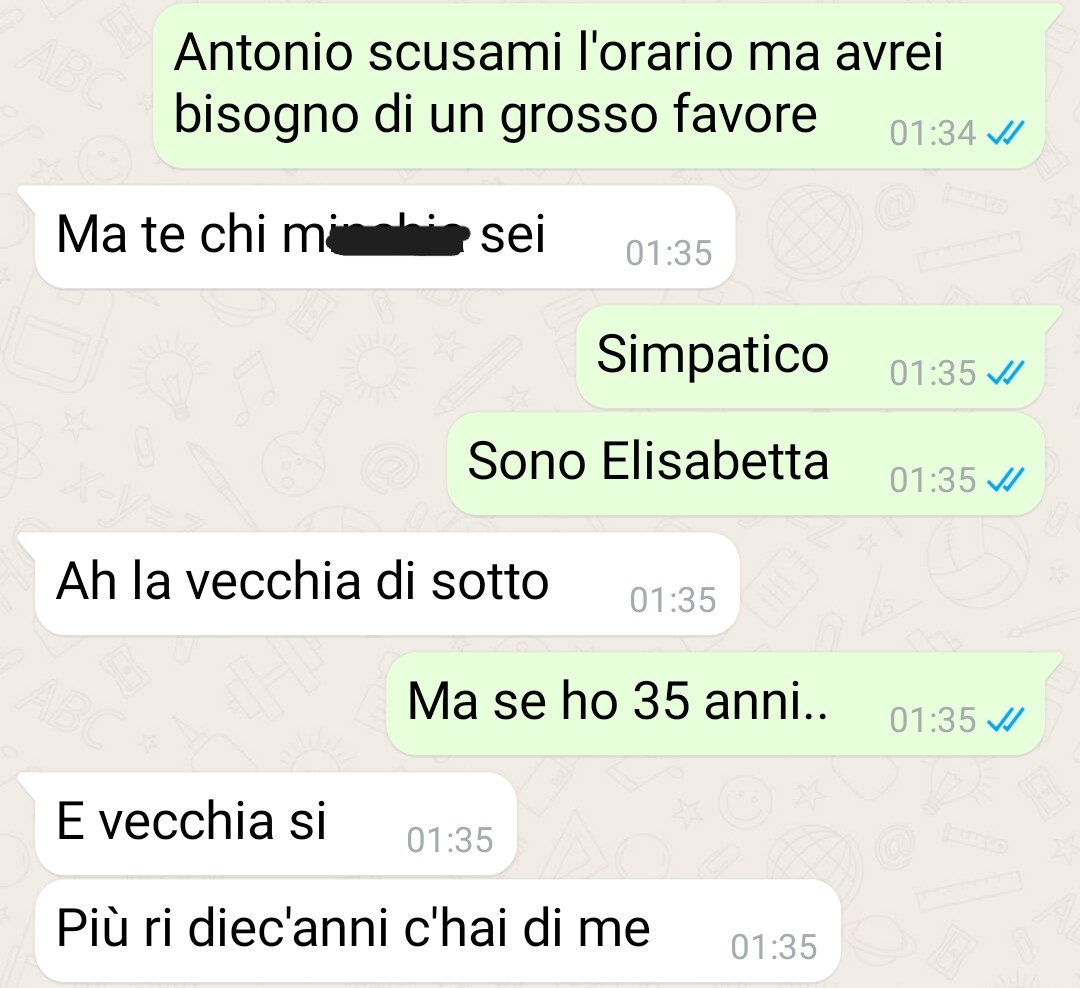 “Sono Elisabetta e una situazione piuttosto brutta che mi è capitata l’altro giorno ha avuto a che fare con una persona che si chiama Antonio, ed è uno quasi completamente sconosciuto. Vivo in un appartamento all’interno di una palazzina piuttosto piccola, i condomini sono pochi e generalmente ci si conosce tutti, ma è arrivato da poco questo ragazzo che sta in affitto e ammetto si comporta non nel modo migliore. Una volta l’ho beccato a gettare la spazzatura dalla finestra, nel senso tutto un sacchetto, e a pulirsi le scarpe nei tappetini altrui, ma di recente, una nottata, la situazione è andata a degenerare. Potreste pensare che si trattasse di musica ad alto volume o qualcosa del genere, ma la verità è che si tratta di tutt’altro, qualcosa così di poco conto per chiunque altro, che normalmente sarebbe stato celere ad aiutarmi e venirmi incontro, e invece mi sono trovata a litigarci la mattina successiva, quando l’ho ricontattato perché la situazione non era ancora cambiata o migliorata.”