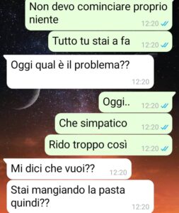 La sua reazione? Beh, potete benissimo leggerla negli screen. Come vedrete, è stato capace di fare quello che solo gli uomini riescono con una facilità disarmante: incolpare me di usare questa situazione per allontanarlo da una persona di cui in realtà non me ne frega nulla.