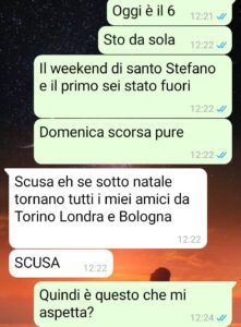 “Ciao spunteblu, con queste feste di natale mi sono resa conto di una cosa molto triste: il mio ragazzo non mi considera mai quando sta con i suoi amici. Non sono la classica ragazza che pretende di essere la priorità in tutto dell’altra persona, ma questa volta penso stia esagerando. Quando il giorno della befana mi sono ritrovata da sola per l’ennesimo giorno, gli ho mandato una foto per fargli capire quanto questa cosa mi sta facendo stare male.