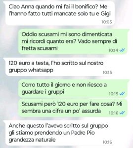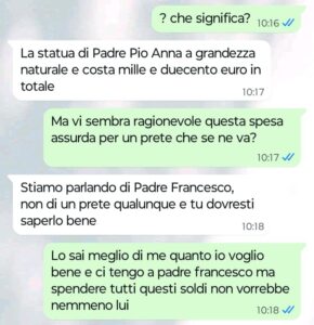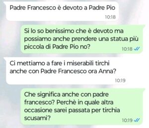 “Buongiorno Spunte Blu vi scrivo perché sono disgustata da alcuni messaggi che ho ricevuto stamattina da una tizia che conosco perché frequentiamo la stessa parrocchia. Io sono molto credente e vado tutti i giorni in chiesa. Sono molto legata a un parroco, Padre Francesco, che ha aiutato moltissimo la mia famiglia quando mio marito anni fa ha perso il lavoro e ci siamo ritrovati sommersi dai debiti a non poterci permettere nemmeno di fare più la spesa per mangiare. Adesso Padre Francesco purtroppo lascerà la nostra parrocchia e oggi questa tizia mi scrive per chiedermi qualcosa che per me è ridicola e inutile e questo non vuol dire che io non voglia bene a Padre Francesco, anzi… per me ha rappresentato davvero la mia ancora di salvezza nel periodo più brutto. Leggete cosa mi ha scritto la tizia e ditemi se siete d’accordo con me o meno per favore “