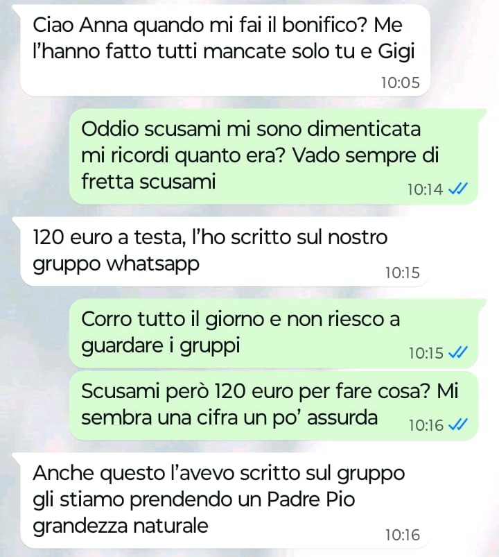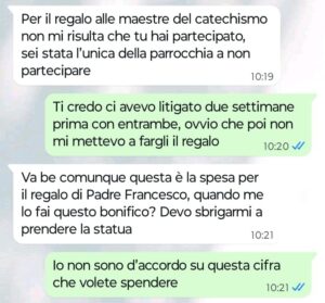 “Buongiorno Spunte Blu vi scrivo perché sono disgustata da alcuni messaggi che ho ricevuto stamattina da una tizia che conosco perché frequentiamo la stessa parrocchia. Io sono molto credente e vado tutti i giorni in chiesa. Sono molto legata a un parroco, Padre Francesco, che ha aiutato moltissimo la mia famiglia quando mio marito anni fa ha perso il lavoro e ci siamo ritrovati sommersi dai debiti a non poterci permettere nemmeno di fare più la spesa per mangiare. Adesso Padre Francesco purtroppo lascerà la nostra parrocchia e oggi questa tizia mi scrive per chiedermi qualcosa che per me è ridicola e inutile e questo non vuol dire che io non voglia bene a Padre Francesco, anzi… per me ha rappresentato davvero la mia ancora di salvezza nel periodo più brutto. Leggete cosa mi ha scritto la tizia e ditemi se siete d’accordo con me o meno per favore “