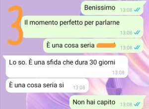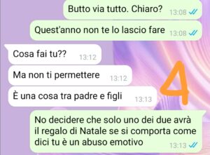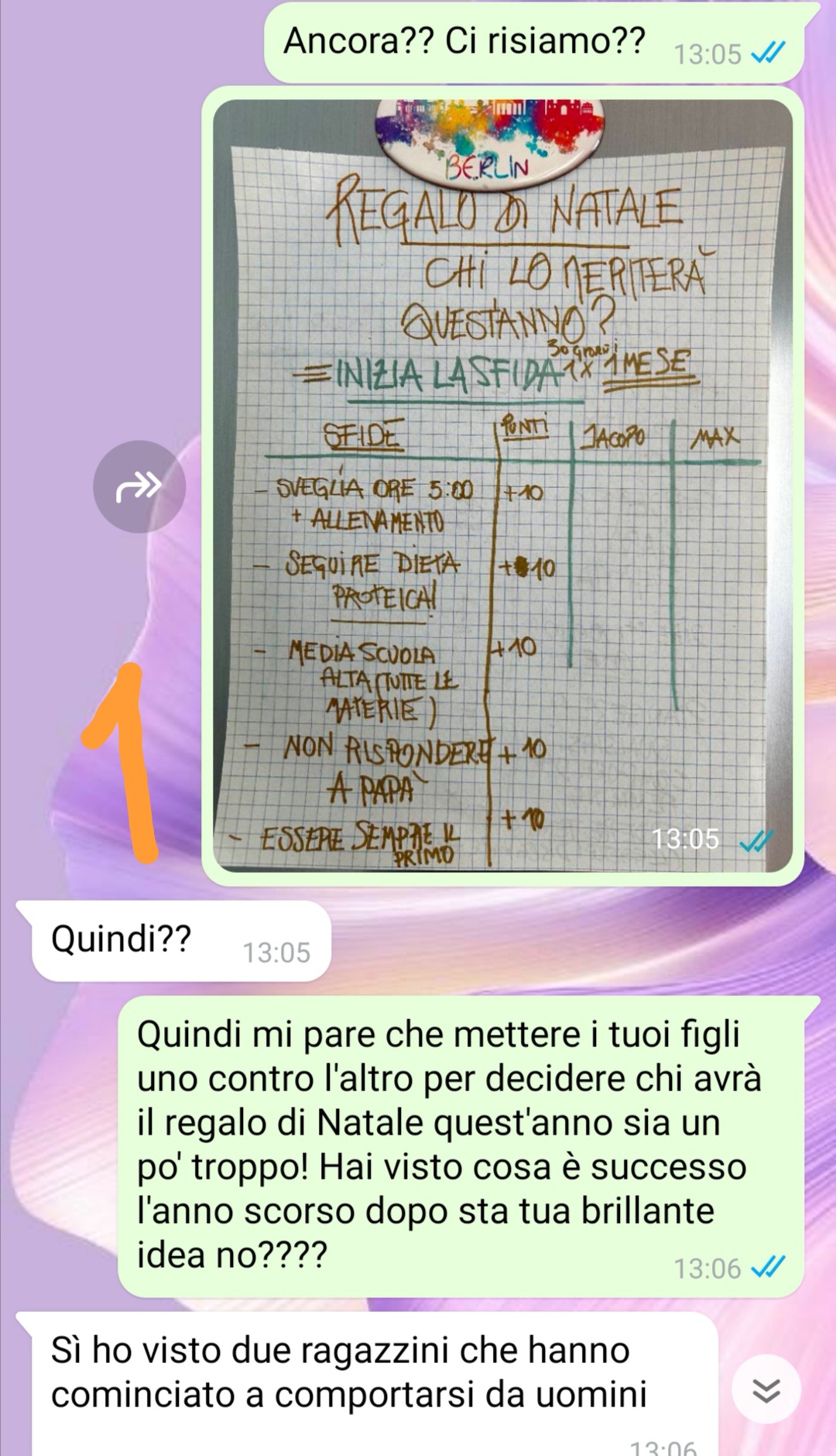 Io la trovavo già un po’ forte come idea, ma mio marito l’aveva messa giù come un modo per insegnargli a comportarsi meglio. Infatti le sfide erano su lavarsi i denti, rifare il letto, aiutare a preparare la tavola… questa sfida dura un mese e non vi dico l’anno scorso cosa non è successo la competizione tra loro era arrivata alle stelle. Credevo che mio marito avesse solo voluto dare loro una ‘lezione’ contro il consumismo…ma guardate oggi quando sono rientrata a casa per pranzo cosa ho trovato. Mi sono venuti i brividi e così gli ho scritto immediatamente…e il resto ve lo lascio leggere. Aiutatemi, ne ho davvero bisogno!”