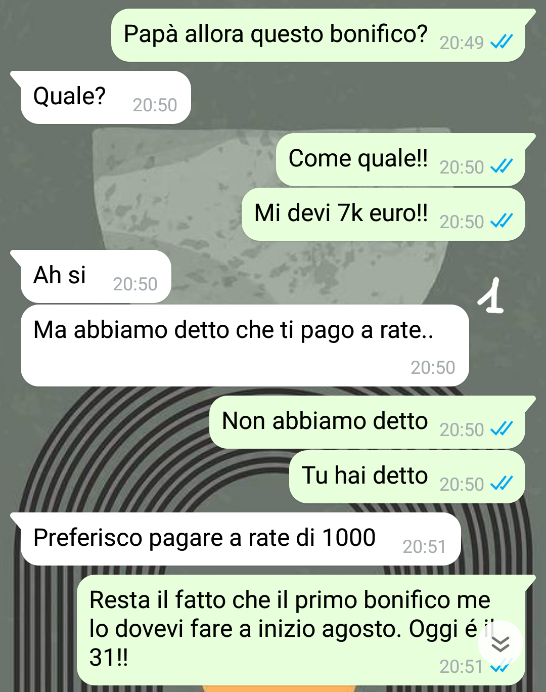Oggi io ho 31 anni, ho un lavoro, una compagna e una vita serena. Il mio padre biologico, che è in pensione da un po’, si è rifatto vivo a inizio anno per chiedermi un favore: voleva dei soldi..