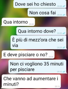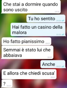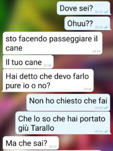 Sono Donatella signori di spunte e questi screen sono tra me e Massimo, la seconda domenica da quando mi sono trasferita da lui. Per la prima volta ha portato a spasso il mio adorato Tarallo, un labrador di 5 anni. E di sua iniziativa (dopo tante richieste da parte mia…) si è alzato presto e lo ha portato al parco vicino casa. Ma avevamo un appuntamento con i miei e ha cominciato a farsi tardi. E lui ancora non torna. Si, avete capito. Era riuscito a perdere un cane bianco di 35 kg al guinzaglio! E no, non può capitare, è menefreghismo allo stato puro. Ma il peggio non è questo. E nemmeno che non mi ha detto niente per ¾ d’ora (e non lo avrebbe fatto se non lo incalzavo per l’orario), in cui potevo cercarlo anche io. L’apoteosi è quando ha cercato di farsi perdonare. Cervello annacquato. E con acqua di fogna.”