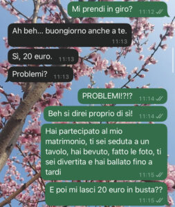 Davvero non mi capacito di come un gesto del genere sia potuto arrivare da una persona che credevo DAVVERO amica. Una persona che ha fatto le foto con me, che ha applaudito, che ha sorriso tutto il giorno… Quindi le ho scritto per chiedere spiegazioni.