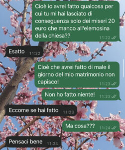 Davvero non mi capacito di come un gesto del genere sia potuto arrivare da una persona che credevo DAVVERO amica. Una persona che ha fatto le foto con me, che ha applaudito, che ha sorriso tutto il giorno… Quindi le ho scritto per chiedere spiegazioni.