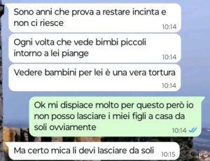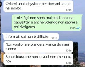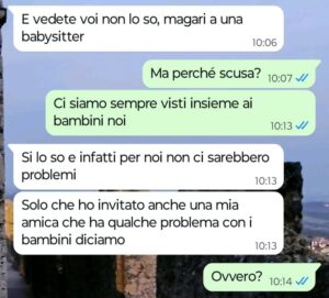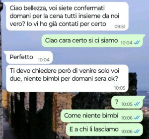 “Buongiorno Spunte Blu, oggi sono qui a raccontarvi qualcosa di veramente incredibile. Domani sera una mia amica ci ha invitati a cena da lei e io naturalmente avevo programmato di andarci con mio marito Giorgio e con i miei due bambini, se non che stamattina questa amica mi scrive per farsi confermare da me la nostra presenza alla cena di domani, ma anche – e sopratutto – per vietarmi di portare i miei figli a cena da lei.