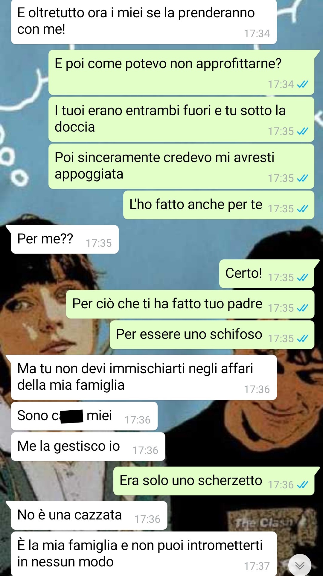 “Dopo la conversazione con Alessia è passata una settimana in cui mi sono preparata per lo scherzo e ho aspettato il momento giusto, ma dopo averlo fatto io e lui abbiamo iniziato una pesante litigata, io non volevo starlo a sentire e me ne sono andata a casa mia. Lui poi mi ha cercata perché non avevamo finito di discutere ed ecco cosa ci siamo detti.”