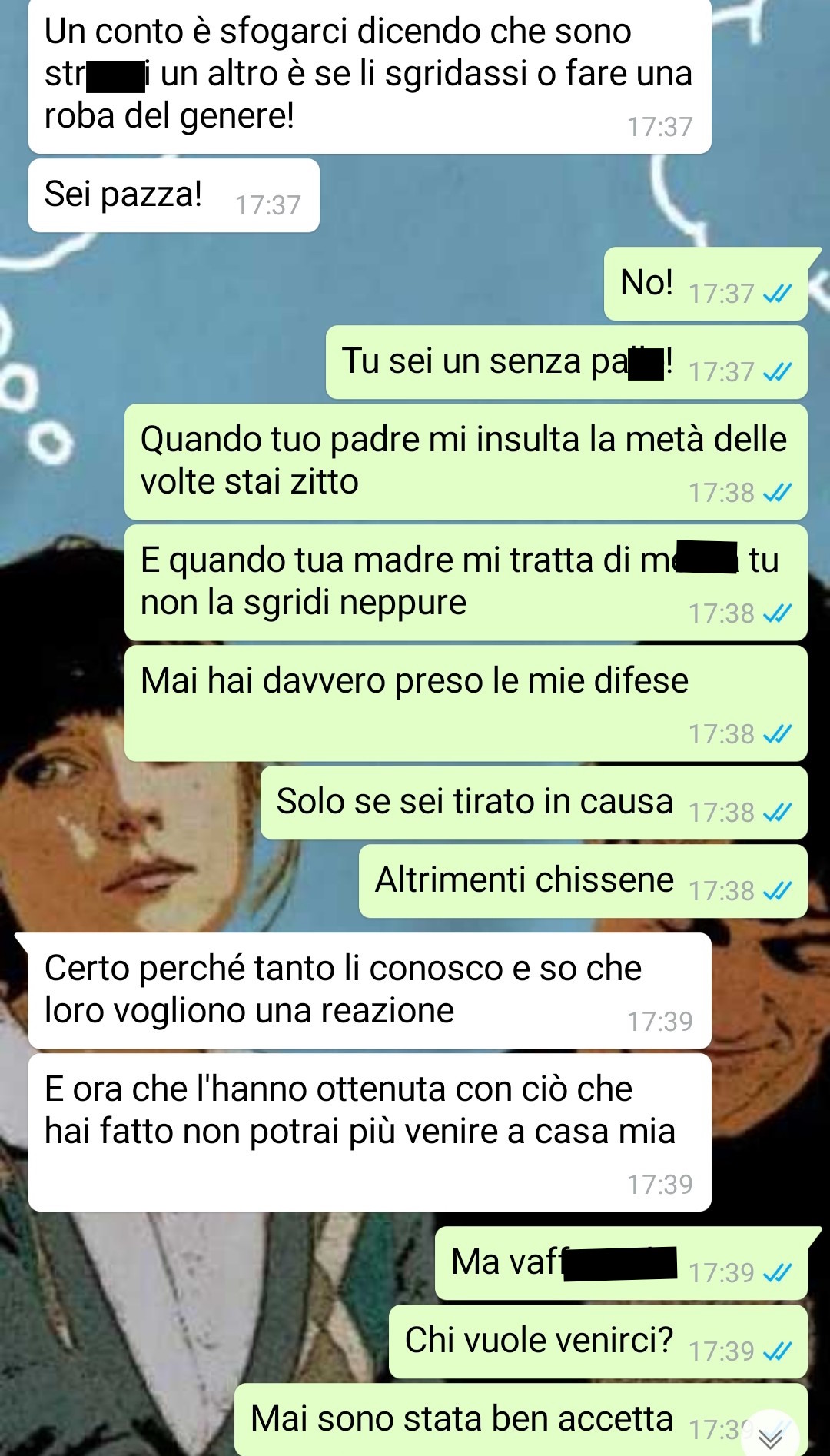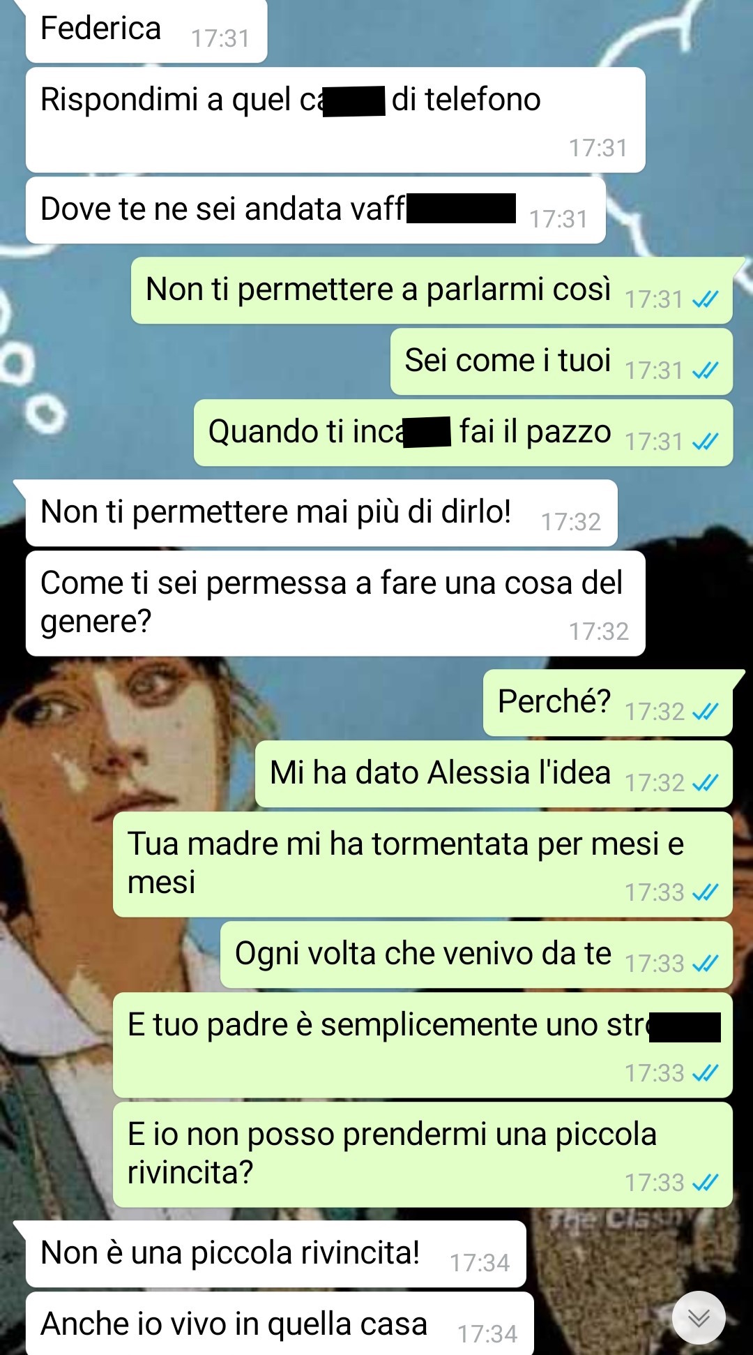 “Dopo la conversazione con Alessia è passata una settimana in cui mi sono preparata per lo scherzo e ho aspettato il momento giusto, ma dopo averlo fatto io e lui abbiamo iniziato una pesante litigata, io non volevo starlo a sentire e me ne sono andata a casa mia. Lui poi mi ha cercata perché non avevamo finito di discutere ed ecco cosa ci siamo detti.”