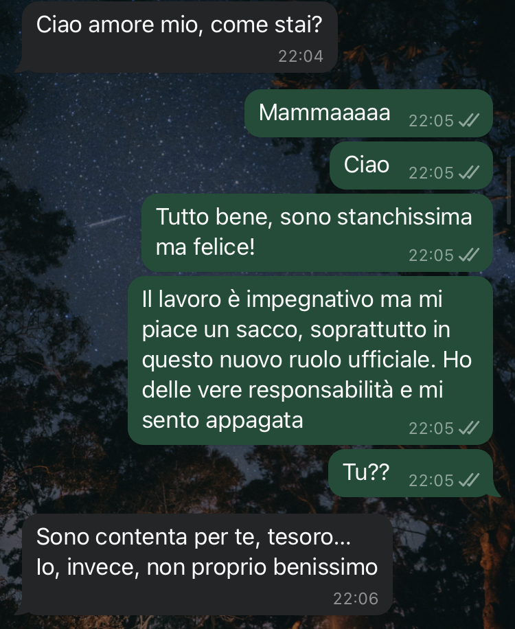 Mia madre è stata una buona madre, mi ha dato la vita e mi ha cresciuta, nonostante le difficoltà non mi ha mai fatto mancare niente e mi ha permesso di studiare, io le sono molto grata per tutto questo. Anche se penso che sia semplicemente il dovere di ogni genitore e che noi figli non “dobbiamo” niente a loro. Comunque, anche se mia madre ha i suoi difetti, siamo sempre andate più o meno d’accordo, almeno fino a qualche giorno fa. Dopo il master ho fatto uno stage in una buona azienda, e dopo di questo hanno deciso di assumermi! Sono stata felicissima. Eppure, da quando ho avuto il contratto mia madre è diventata un incubo perché ha iniziato ad avanzare delle pretese incredibili verso di me e io non so cosa fare… Dovrei accettare la sua richiesta secondo voi? Ditemi voi cosa ne pensate…