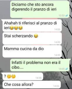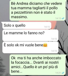 Come se una trentina di trentenni e una madre seduta in mezzo con la teglia di parmigiana fossero la cosa più naturale del mondo.