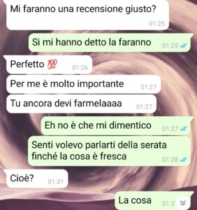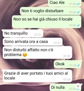 “Ciao a tutti quelli che leggeranno queste righe. So già che mi attirerò parecchie inimicizie e che in tanti non mi daranno ragione, ma voglio farvi capire che il mio ragionamento nella storia è giusto, è così che dovrebbe andare il mondo. Poi che io me la sia presa troppo per una cosa che non era nulla di che possiamo anche essere d’accordo, anche se un atteggiamento del genere da parte della mia interlocutrice me lo potrei aspettare da una persona totalmente sconosciuta, non da una che conosco da anni. Però è proprio vero, non si dovrebbe essere amici delle persone che hanno locali o che ci lavorano perché poi finisce sempre male. Io ammetto che ho sempre trovato disagiante andare in locali con amici camerieri o proprietari, perché stanno lì a servirti mentre tu ti diverti e questa cosa mi mette davvero a disagio. Giusto qualche giorno fa sono andato con una coppia di amici in questa pizzeria che è gestita da una nostra amica ed è successa una cosa che non mi ha fatto piacere. Io ho evitato di fare questioni, ma quando ero a casa poi di notte ho scritto a sta ragazza giusto per dire che ci ero rimasto male ed è partita la litigata.”