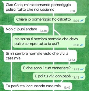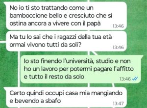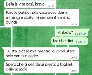 “Ciao Spunte Blu, mi chiamo Carlo e sono un ragazzo di 21 anni. Mamma è morta cinque anni fa per colpa del cancro e papà due anni fa purtroppo ha deciso di iniziare a frequentare un’altra donna. Questa donna quindi sarebbe una specie di matrigna per me, anche se lei e papà non si sono mai sposati, ma noi viviamo a casa sua. Vi dico subito che lei fa pena, è una persona veramente odiosa che si diverte a trattarmi male e a farmi fare robe da schiavo. Praticamente se ne approfitta del fatto che io e papà ora viviamo a casa sua per trattarmi come il suo cameriere personale. Ogni volta che provo a parlare con papà di come mi tratta la sua nuova compagna lui minimizza, dicendo che non è vero e che sono io ad essere troppo esagerato. Ma leggete la mia chat e ditemi, sono veramente esagerato oppure è questa donna ad essere una vera strega tipo quella dei cartoni della disney? Papà non capisce, lui non mi capisce ed è bruttissimo quando perdi la mamma e tuo papà nemmeno ti crede. Mi sento solo e depresso, senza nessuno vicino a me che mi aiuti.”